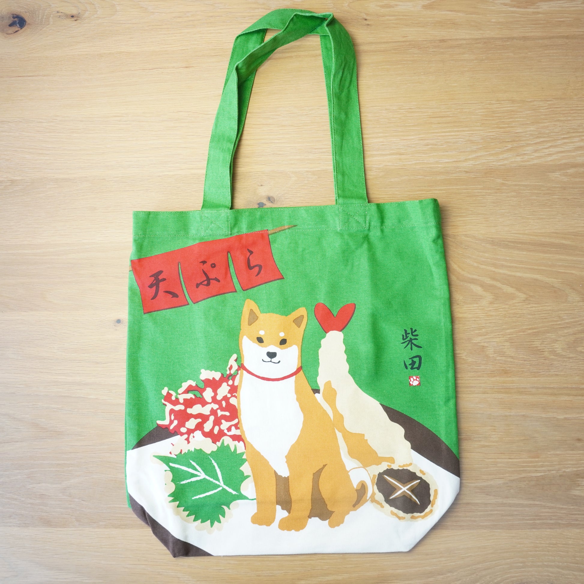 🍤In this green bag, Shiba is sitting on a plate with some crispy Tempura! The Japanese word printed on the top says “Tempura”.