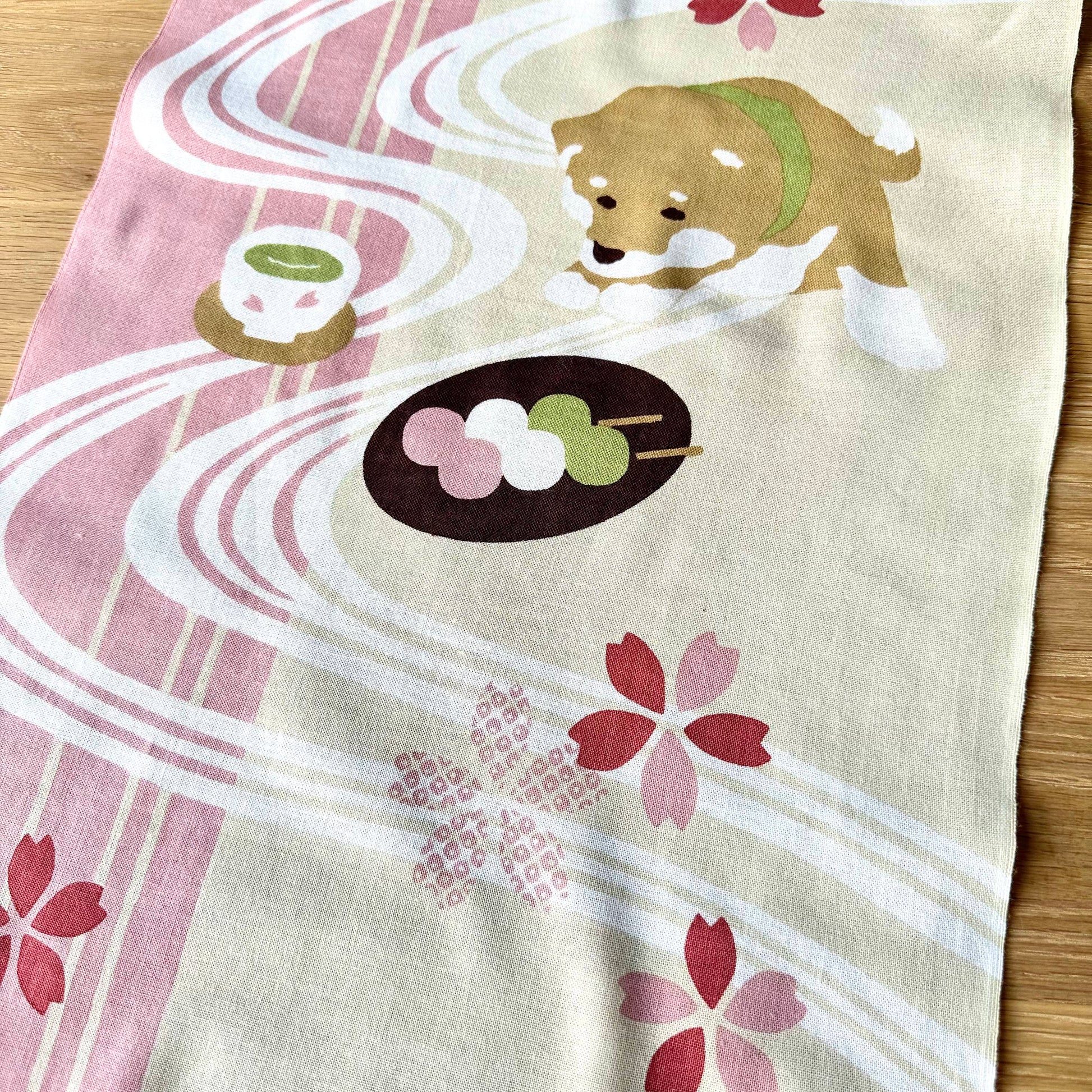 Tenugui Art, Shiba with Matcha and Dango, 34cm x 90cm (13.4” x 35.4”)